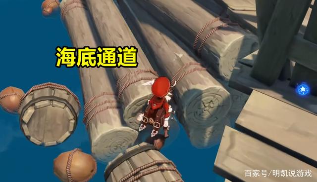 《原神》三角海底通道在这里向三角区域跳跃并下落攻击,沉入水面的一瞬间钻入水底一排木柱(如图可莉正前方水底的木柱)的下方,然后向这排木柱的左边游,有概率进入海底。