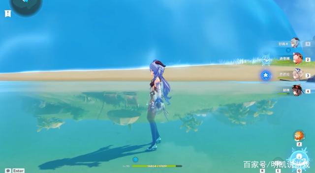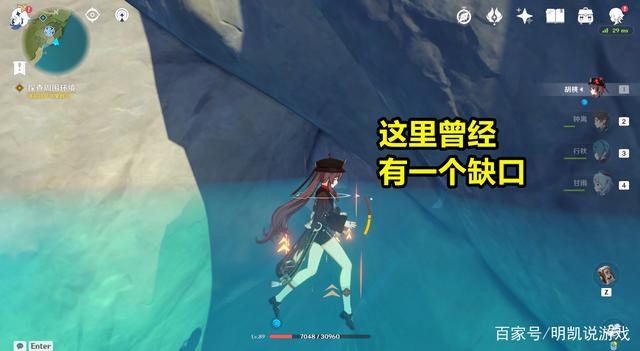 《原神》此处曾经有个缺口于是操控着角色向缺口游去,发现角色可以从缺口向下攀爬,非常顺利就进入了海平面以下。但因为《原神》海底空无一物,根本找不到鱼,四处搜索几分钟之后,便传送离开了此处。