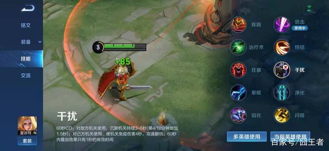 坦率地说,疾跑、干扰、晕眩和狂暴,这几个召唤师技能热度大致差不多。硬要说个高低的话,干扰的热度更高一点而已。目前干扰这个技能大都是辅助英雄带,比如孙膑和瑶,干扰这个技能在KPL职业赛场上很火,主要是用来越塔强杀射手的;同时,干扰还可以用于守塔。而其他三个技能,带的英雄都比较有限,疾跑一般适合马超、关羽和蒙犽这样的突进型英雄;而让晕眩则适合马可波罗和孙策这样少控制的英雄,主要用于短暂控制后打满伤害;狂暴带的就更少了,常见的狂暴,只有公孙离和以前的后羿!