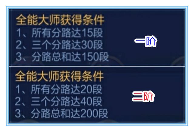 一阶全能高手的要求有三个:每个分路的段位要达到5段,有三个分路的段位达到10段,所有分路的总和达到50段。二阶全能高手的要求同样也是三个:每个分路的段位要达到10段,有三个分路达到20段,所有分路的总和达到100段。是不是看到这里就有人感觉事情不大对劲了,单单是一个全能高手就要求分路总和达到100段了。不要急,下面的条件更夸张。