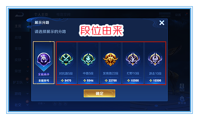 最后给大家科普一下段位的由来吧,大家看上图,如果你对抗路战力前五名英雄的总积分是5400分的话,你对抗路的段位就是5段,也就是说当你的分路战力在5001至5999之间时,你的分路段位都是5段。