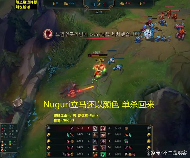 但作为S10的冠军上单,Nuguri丝毫没有因为一级被单杀就崩了心态,在复活之后直接是传送到正在清兵的小虎面前,先是E技能清小兵升了2级,同时E技能也拍到了小虎,由于小虎之前越兵线拿下了Nuguri的一血,此时血量也是不太健康,Nuguri找准机会E二段减速小虎,在小虎撤退到兵后面直接一波闪现Q技能踢中小虎跟着平A将小虎单杀,两个人打得那叫一个有来有回,非常精彩。