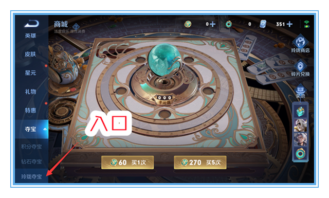 玲珑夺宝的位置在积分夺宝和钻石夺宝下面,单次夺宝需要消耗60玲珑积分,连续5次的话则只需要270积分,这里的规则和之前的夺宝几乎相同。