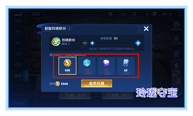 500金币可以兑换60玲珑积分120铭文碎片可以兑换60玲珑积分60钻石可以兑换60玲珑积分60点券可以兑换60玲珑积分简单点说就是,如果你有足够多的金币、铭文、钻石,你就可以免费获取皮肤、英雄以及各种稀有资源。