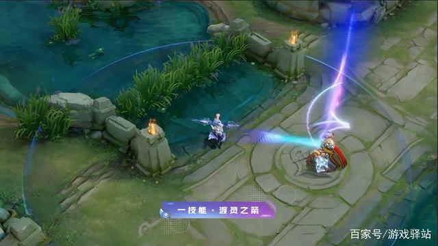 1技能渡灵之箭,拉开长弓后伽罗射出一支有着紫蓝白的渐变色箭矢,且附带旋转拖尾特效,命中敌人有蓝紫粒子四溅,以及有流动的蓝紫渐变光效升起,
