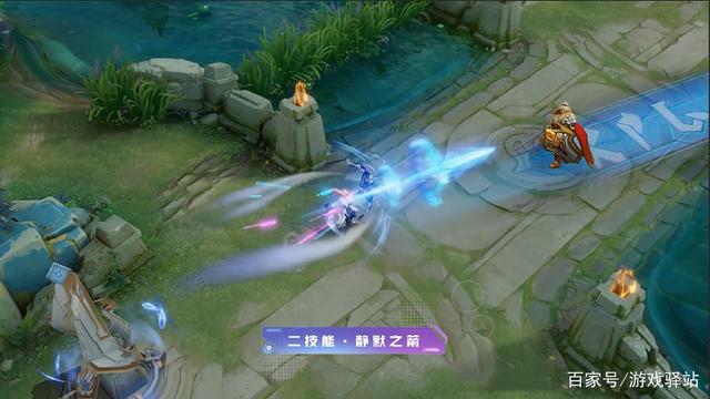 2技能静默之箭,伽罗释放的破魔之箭变成了一只蓝紫色巨型箭矢,附带粒子特效,看起来力量感十足,技能路径末端还会出现“KPL”的立体字母特效。