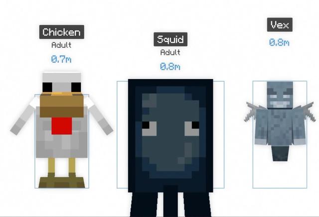其实在很多时候,恼鬼只是看上去小。事实上恼鬼的身高已经达到了0.8m,相当于五分之四的草方块高了。如果你还没有脑补出来有多高,鱿鱼我们经常遇到,恼鬼则是与鱿鱼一般高。鸡我们都经常遇到,鸡的身高为0.7m,也就是说恼鬼要比鸡都要高。我们再来深入了解一下生物们的身高,以恼鬼为基准,哪些常见的生物比恼鬼高,哪些比恼鬼低呢?
