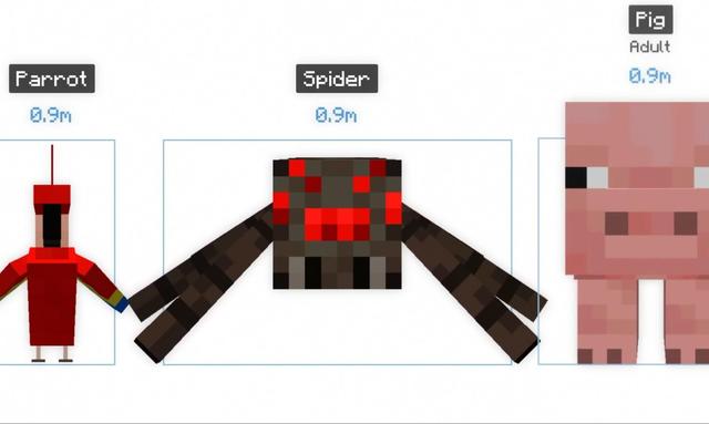 鹦鹉在mc鸟类当中属于比较高的生物了,它的身高为0.9m,高度要高于恼鬼,这倒是一个比较意外的发展。还有一个有趣的发现,前面我们说的是洞穴蜘蛛,它的身高为0.5m。然而蜘蛛的身高则为0.9m,二者的差距还是比较大的,不同种类的蜘蛛的身高并不相同。猪与鹦鹉、蜘蛛一般高,也同样为0.9m。