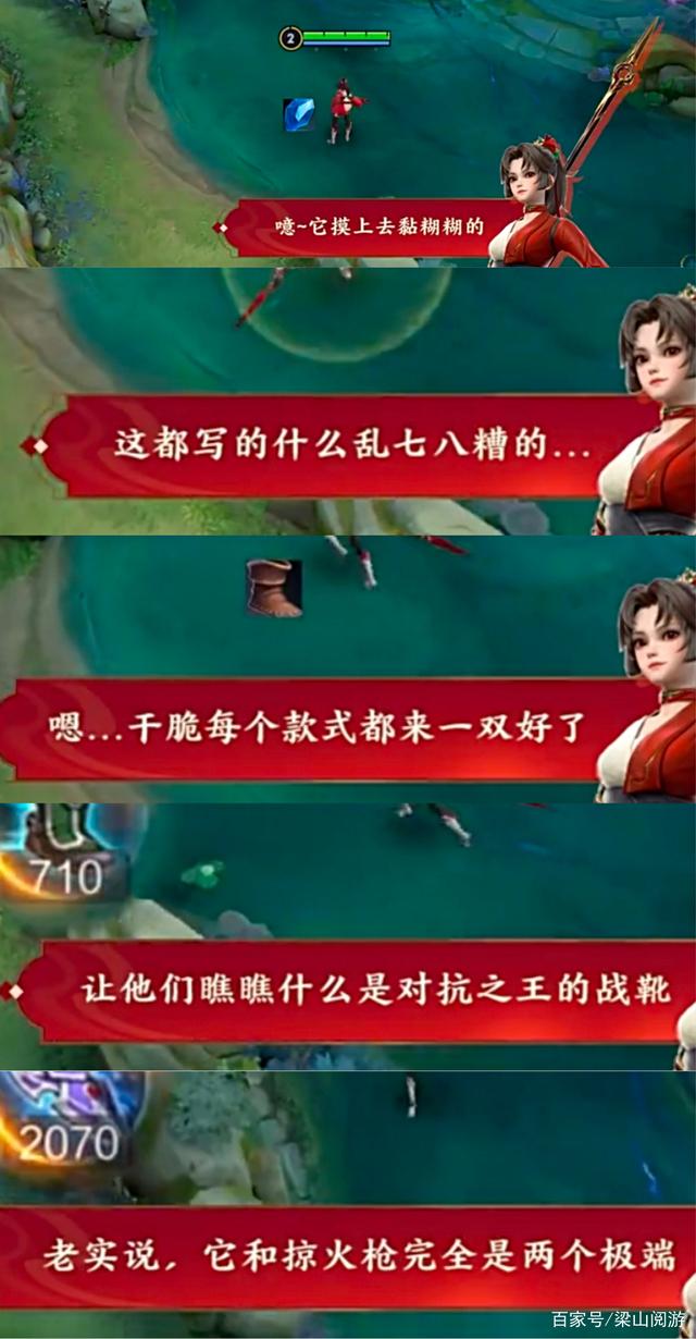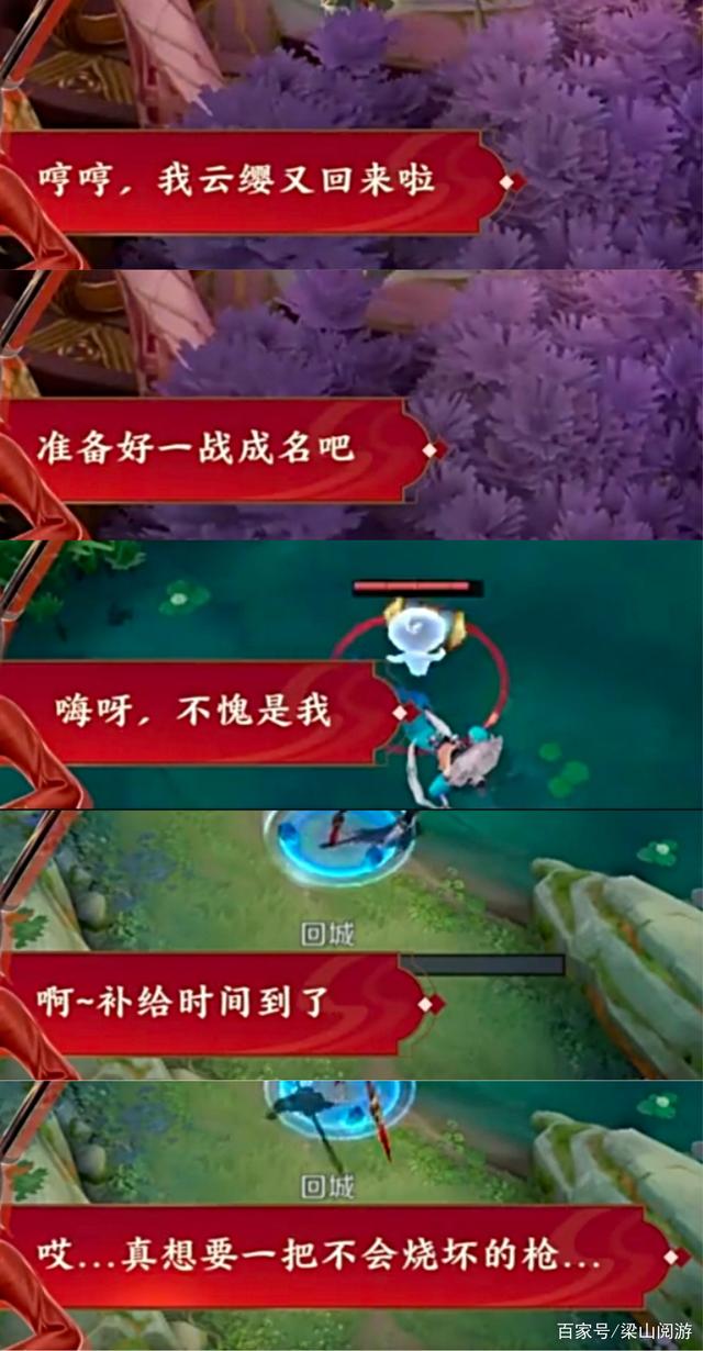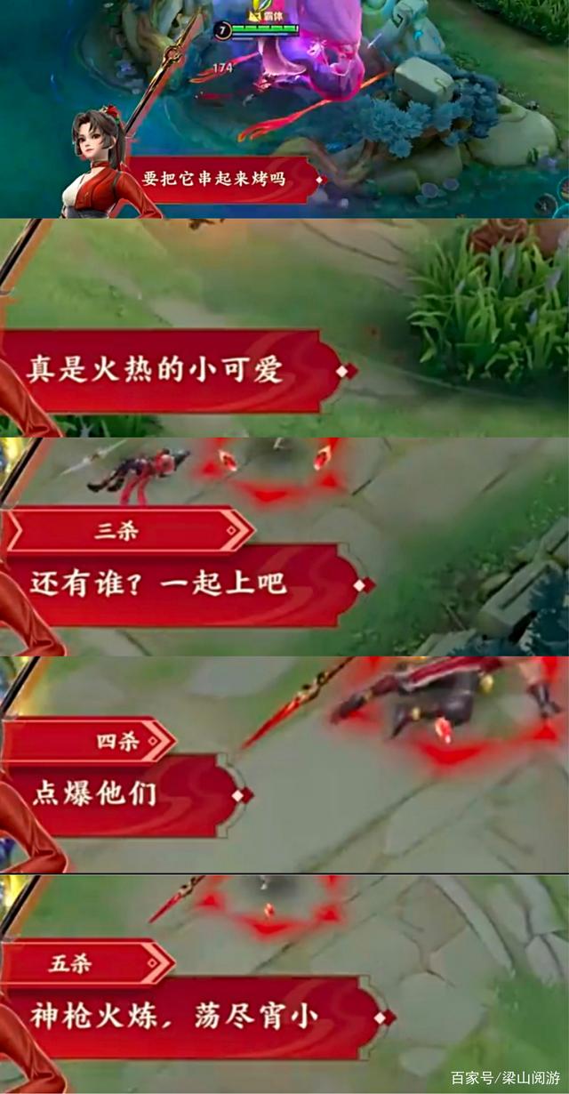 另外遇到沈梦溪和不知火舞,会称他们为纵火犯;打败裴擒虎时会轻蔑地说:三脚猫,老虎估计要哭晕了;遇到赵云会称为师兄,毕竟同为耍枪的;击打云中君时会说:枪打出头鸟。