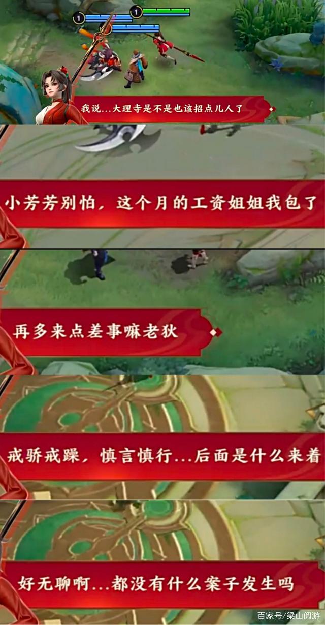 她称呼李元芳为小芳芳,自称姐姐、叫狄仁杰为老狄,有意思的是当同时遇到这两个英雄时,云缨会绕着他俩转圈并且念叨着:我说,大理寺是不是也该招点人了。语气显得中气不足,像极了职场中的人,我猜是云缨的策划师所在的部门人手不够,熬夜加班太严重了,于是他就把这个问题带到了游戏中,非常有意思。
