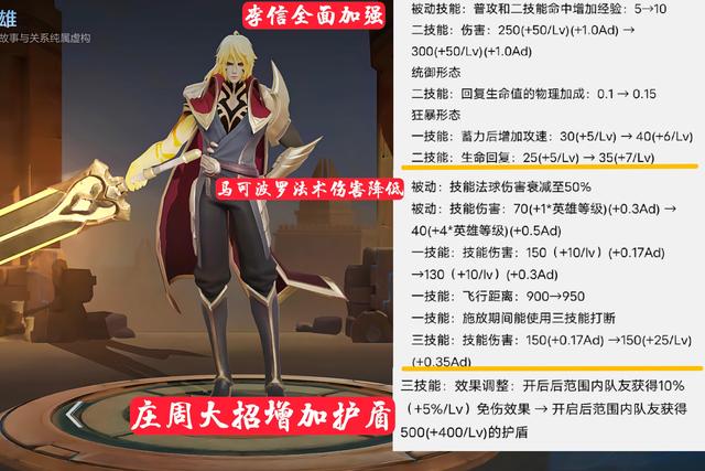 李信迎来了全面加强的,优化了bug,并且所有技能全部都有小幅度的提升,新赛季想要使用李信上分的玩家又可以拿出来了。马可波罗被动法球效果伤害削弱一半,虽然对一技能和三技能的伤害进行了增加,但是需要补足输出装才能够有伤害,更加考验马可波罗的生存环境了。庄周的大招进行调整,把免伤效果改成了增加护盾,这种看得着的保护机制,或许能够改变庄周目前毫无作用的地位。