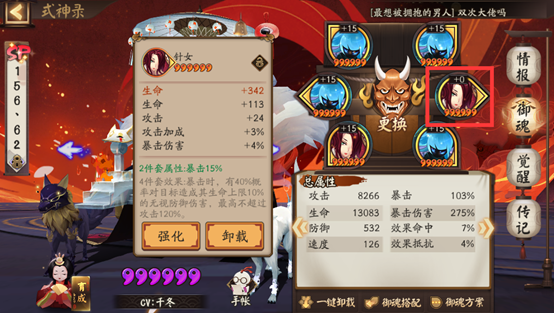 然后计算出来的御魂穿上后,再将五号位的御魂换成没强化的,御魂星级越低越好,因为它只是用来激活御魂套装属性的。