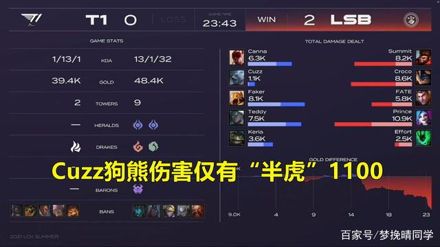 这场比赛几乎是LSB单方面暴打T1,LSB后续的下路对线也慢慢拿到了优势,上中野频繁的联动让T1招架不住,而沙皇和赛纳又是两个需要发育的英雄,但自己家的盲僧和狗熊前期没有拿到优势的情况下根本没人能在中期站出来,LSB拿掉大龙后很快结束了这场比赛。赛后数据中看到Cuzz的狗熊仅打出了“半虎”1100点的伤害,而且不同的是小虎的瑞兹前期比较弱势,而且在劣势的情况下伤害低还可以理解,但是狗熊作为前期非常强势的英雄在Cuzz手中差点伤害量没到4位数,这又有些夸张了。