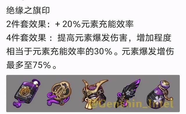 新圣遗物【绝缘之旗印】!这套新的圣遗物,其实就是之前1.6版本更新前就有消息的一套圣遗物。只不过当时的消息很残缺,只知道是充能相关的圣遗物,四件套效果是根据充能效率增伤。这套圣遗物的完整效果,以及圣遗物的模型现在都非常详细了。 两件套效果:增加20%的元素充能效率!四件套效果:提高元素爆发伤害,增加程度相当于元素充能效率的30%,元素爆发增伤最多至75%。别的不说这造型真的是充满了日式风格,一看就知道是以日本武士形象制作的圣遗物模型。圣遗物头是武士头盔,圣遗物花是刀镗的形象,圣遗物杯是清酒酒壶的形象。