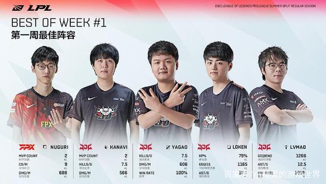 而在第一周比赛结束之后,官方也公布了首周的最佳数据,其中最受关注的当属首周的最佳阵容了,最终上榜的选手分别是:上单Nuguri、打野Kanavi、中单YaGao、AD:LoKne、辅助LvMao,从榜单中我们可以看到,除了上单Nuguri之外,其他四个位置都是JDG的选手,这也可以看出JDG首周的表现有亮眼了。