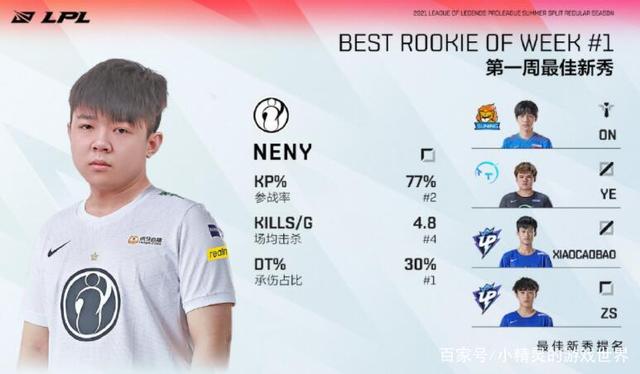 而获得首周最佳新秀的是IG的上单选手Neny。因为疫情的原因,Theshy没能赶上IG前期的比赛,所以IG只能把Neny从二队调上来,上场前,很多人都不是很看好他,但他却用自己的表现征服了观众。IG的揭幕战,赛前大家都以为会是Rookie一带四,没想到Neny却扛起了大旗,一手猴子也给我们留下了深刻的英雄。而在对阵EDG的比赛中,IG虽然输掉了比赛,但第二局Neny多次找机会也是帮助队伍挽回劣势,奈何队伍的整体劣势太大,最终还是输掉了比赛,但他的猴子也拿下了10/0/6的超神战绩,一次都未死。而在看到Neny的表现之后,有网友也是调侃,Theshy回来之后可以转去AD位了。