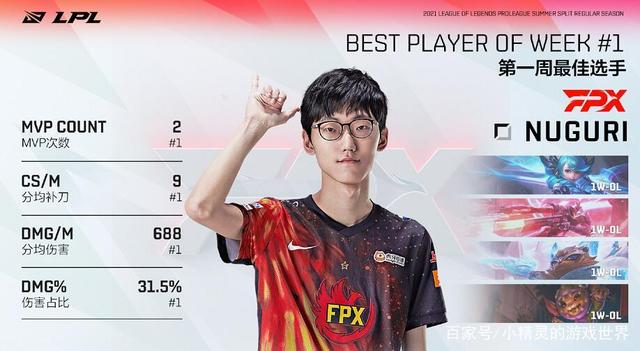 而获得首周MVP的选手是FPX的上单Nuguri,不得不承认,Nuguri可以说是目前LPL上单的独一档了,不管是什么英雄都是驾驭,而且非常的稳,失误率也非常低,不管对阵谁都能打出自己想要的结果,在对阵UP第一局的卢锡安,相信大家都历历在目吧?11/2/0的超神战绩,也让我们不得不佩服他的表现。