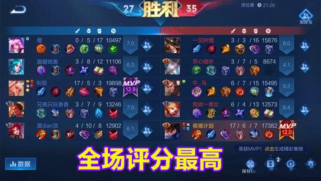 在有些时候,我们就会遇到一些非常弱,或者状态特别不好的队友,哪怕自己玩得非常好也带不动,或者是演员,想要故意输的队友,所以这种时候我们尽最大的努力,甚至还可能可以拿到全场最高的评分,表现是无可挑剔的,这种情况下输了确实会很难受,如果可以全场评分最高输了不掉星的话,那么其实还是可以试一试的。