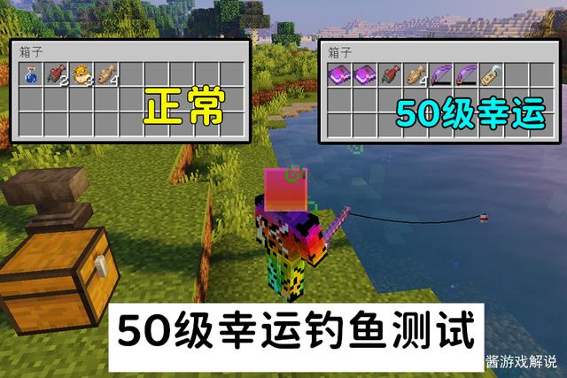 如果你还无法理解幸运的作用,那么以钓鱼为例。图酱分别在无幸运加成下和50级幸运加成下用同一把鱼竿各进行了10次钓鱼,该鱼竿仅附魔了可以减少垂钓时间的饵钓,无其他提升宝藏出现几率的附魔。