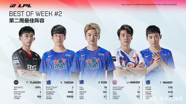 接下来是LPL夏季赛第二周最佳阵容正式榜单,同样身处两连败的豪门RNG、IG颗粒无收,本期最佳阵容由EDG、LNG、乐观战队LGD承包,其中LNG无疑是大赢家,状态火热的冷少Tarzan获封最佳中野,开团效率极高的iwandy获封最佳辅助,EDG圣枪哥与LGD核心C位Kramer斩获最佳上单、最佳ADC荣誉。
