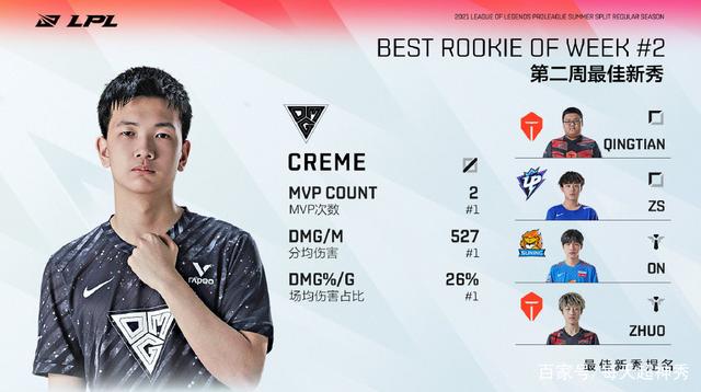 与往常一致,在第三周的首个比赛日,综合评定所有LPL职业选手的最佳阵容出炉,首先看到的是最佳新秀荣誉榜。坐镇OMG中路,率队接连击败豪门IG、RNG的新生代中单Creme获封周最佳新秀,一同出镜的新秀还有TES晴天、小Zhuo、UP上单ZS,以及与Huanfeng并肩战斗的SN辅助ON。