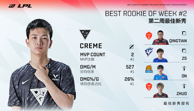 伴随着2021年英雄联盟LPL夏季赛第三周常规赛即将开始,英雄联盟赛事官方也是在常规赛第三周的第一日公布了LPL第二周最佳阵容、MVP以及最佳新秀。那么,在经历了第二周的鏖战之后,又有哪些职业选手成功入榜呢?就让我们一起来了解一下吧!