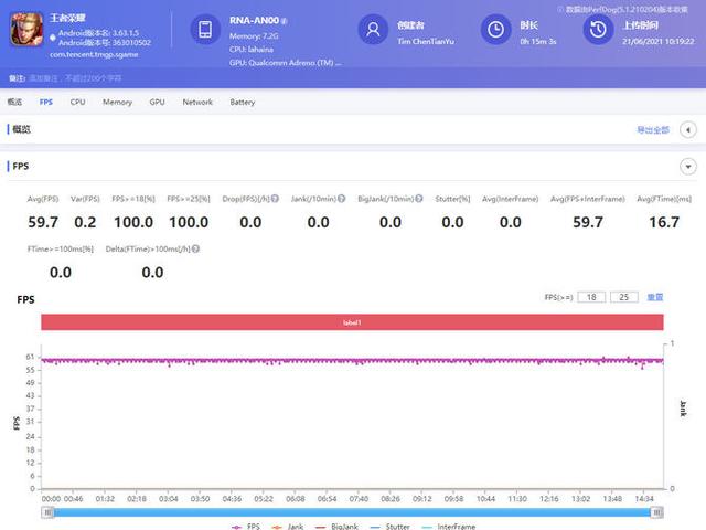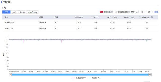 首先看一下荣耀50 Pro的表现,可以看到荣耀50 Pro在一局游戏中平均帧数是59.7帧,游戏能长时间保持在60帧左右,而在游戏过程中没有出现任何的卡顿,游戏可以非常流畅运行。