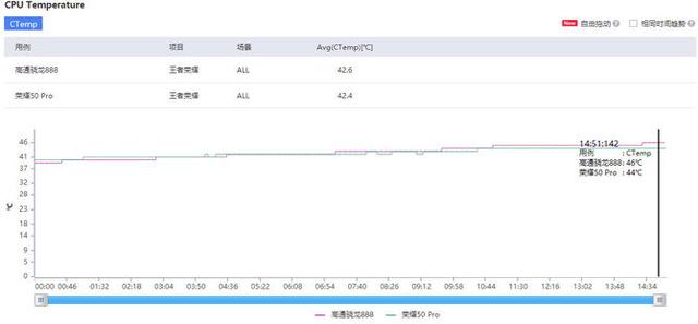 再来看看温度曲线,可以看到荣耀50 Pro游戏开始时候温度是40°C,到游戏结束的时候温度也只有44°C,温度只升了4°C。高通骁龙888的手机游戏开始时的温度是38°C,游戏结束的时候温度已经升到了46°C,温度升了8°C。可以看到,在相同的游戏环境下,荣耀50 Pro的温度控制更为出色,更好的温度控制,让手机能发挥更好的性能。