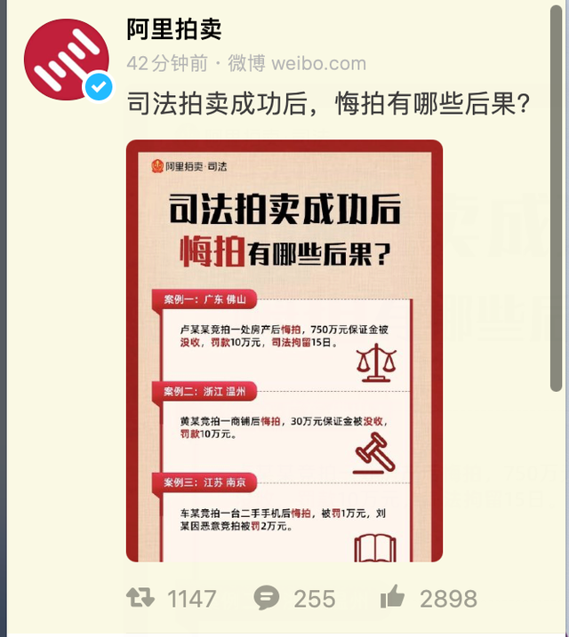 随后,阿里拍卖也在官方微博发了一张图,名为《司法拍卖成功后悔拍有哪些后果》,其中举例子指出:卢某某曾拍下一处房产悔拍,其750万元保证金被没收,罚款10万元,司法拘留15日等等。很显然,阿里这举就在暗示今天的游戏卡牌拍卖闹剧。
