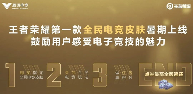 要说买皮肤返点券,也跟这个全民电竞要出的开黑皮肤有关了。参加这个活动主要分为三个步骤,首先玩家需要个购买指定的全民电竞皮肤,然后再参加全民电竞这个玩法,通过这个活动做任务赚取积分,最后通过获取的积分来决定返还多少点券,最高是可以全部返还的,也就是说参与活动的话,是可以白嫖到全民电竞这款皮肤的。