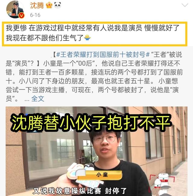 不过沈腾这两天打游戏可是遇到了烦恼,还在社交平台上进行了一番倾诉。原因就是在沈腾刷新闻的时候,也是看到了一个消息,引发了沈腾的共鸣。起因就是一个小伙子,因为自身的技术非常的出色,所以打算着去当主播,但是当主播之前必须有一个“招牌称号”,往往这样才能够吸引更多的玩家去瞩目,后来就打算用貂蝉作为招牌英雄,并且还打上了国服前十,当足以有信心去当个游戏主播的时候,没想到账号突然被当演员给封了,这让小伙子的信心全失,也就意味着之前坐出的努力全都白费了,申诉也没用,于是小伙子就求助了媒体,请教媒体的帮忙。就因为这样,使得沈腾看到了,沈腾老师也是直接安慰这个小伙子。