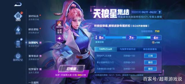 最后看价格,作为传说级限定皮肤,太华和众多传说级限定皮肤一样是1788点券,而天狼星溯光者和以往KPL限定一样,先是以60点券预订,再支付六折尾款888×0.6=472,那么只需要532点券即可获得天狼星溯光者。平心而论KPL限定皮肤无疑是性价比最高的限定皮肤。