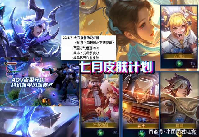 六月份还没有结束,七月份的皮肤计划便被曝光出来。大乔白鹤梁联动史诗皮肤绝美,守约世冠传说皮肤板上钉钉,典韦机甲皮肤六元秒杀,扁鹊春节期间曝光出的勇者皮肤钻石夺宝获得。除此之外,考虑到7月份是暑假黄金月,所以除了以上被确定的皮肤之外,干将莫邪的胡桃国玩偶娃娃皮肤和安琪拉的漫客少女皮肤也很可能在7月份上线。目前安琪拉的这款史诗新皮肤建模、出场动画和漫画书特效都被曝光出来。