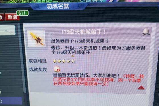 在每一个服务器,第一个达到175级角色的玩家都可以获得成就点,这里面就包括着本服务器,还有本门派的第一个175级弟子的成就,上面的就是天机城的175级弟子,或许有玩家会想着直接从其他门派转过去不就可以获得服务器首个成就了吗?但是这里面是有限制的,那就是通过转服或者转区的方式到达该门派的玩家,在三个月内不可以获得,而且同一个玩家在所有的服务器内只能获得一次。