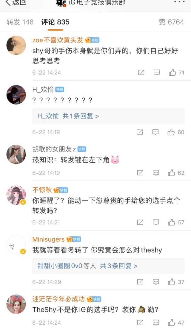 然而在Theshy发文澄清未能上场原因后,IG官博却被粉丝爆破,原因是这本应该是战队自己发声明来解释的,结果让Theshy自己来发文解释,许多粉丝也是纷纷艾特IG官博转发一下Theshy的发文,但IG官博依旧无动于衷,这一举动也是惹怒了粉丝,纷纷留言质问:为何每次都要选手自己来辟谣?Theshy不是IG自己的选手吗?