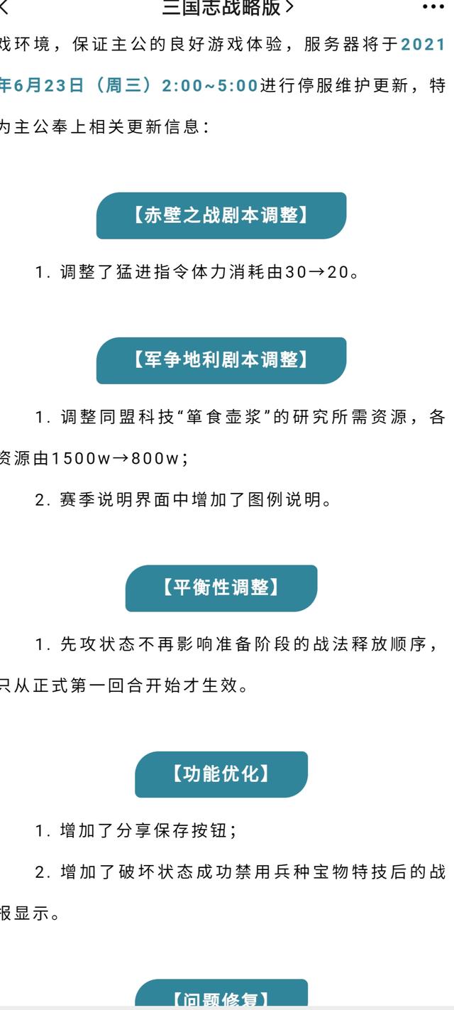 三国志战略版的更新基本上是在每周三进行,在大部分情况下,周三的更新只是例行更新,并不涉及到大的改动。偶尔会出现对战法的调整,以及剧本的改动。对于这样的更新,一般称之为实质性的更新。