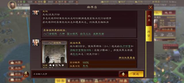 涉及到的战法包括八门金锁阵、白马义从,涉及到的武将包括黄月英、孙权、凌统。