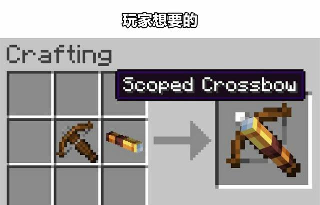 新版本加入了一个叫做望远镜的道具,可以把远处的物体放大。这个道具的作用还是很不错的,但如果能用在弓箭弩箭上那就更加完美了,就好像狙击枪一样,可以先瞄准再进行射击,所以玩家自制了带望远镜弩的合成配方。