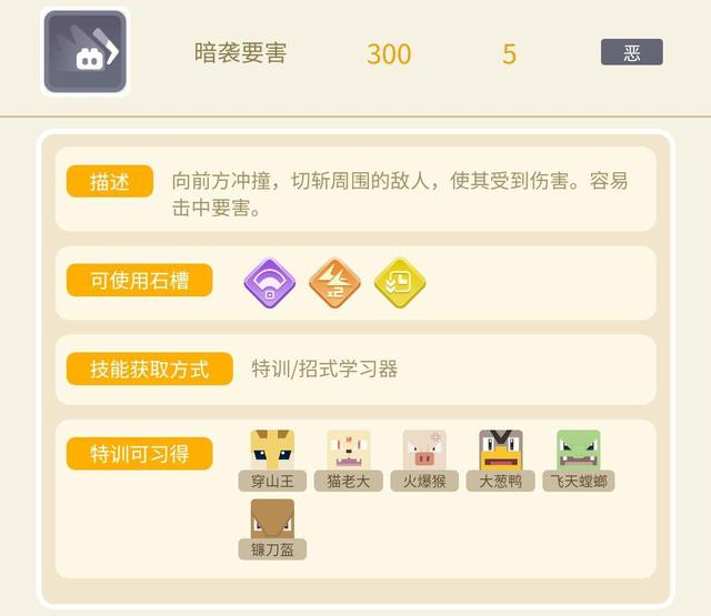 能通过特训学习技能的有穿山王、猫老大、火爆猴、大葱鸭、飞天螳螂以及镰刀盔。目前使用最多的就是飞天螳螂,不过由于暗袭要害是恶属性,与飞天螳螂的虫属性不搭配,所以螳螂的宾果奖励最好是加攻击力的,如果三个宾果奖励全是加攻击,那就是极品了。暗袭要害虽然ATK值不高,但很容易击中要害,也就是容易暴击,伤害会成倍提升。