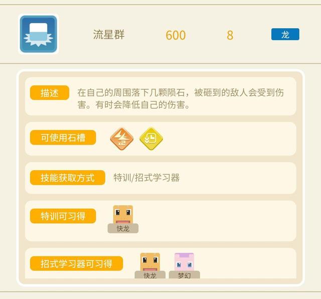 目前能通过特训获得流星群技能的只有快龙,这也是为何快龙备受青睐的原因,很多玩家甚至为了一只快龙重玩账号,因为这只宠太稀少了,出极品的概率更是低得可怜。快龙的强势之处有两点,一是可以学习流星群,这个技能ATK高,是范围攻击,不好躲。二是快龙的种族值非常高,可以说是如今最高的。