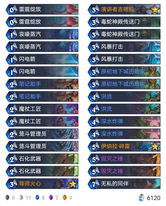 布鲁坎以前是作为黑科技卡牌存在的,有了稳定抽自然法术的原初地下城历险者,布鲁坎+闪电箭的6血斩杀就很容易凑齐了,上限还能双闪电箭6费打12血。正是有了这套combo的出现,萨满既有场面又有法术直伤斩杀,才能神挡杀神。布鲁坎如今已经不再是黑科技卡牌,而是萨满的斩杀核心。