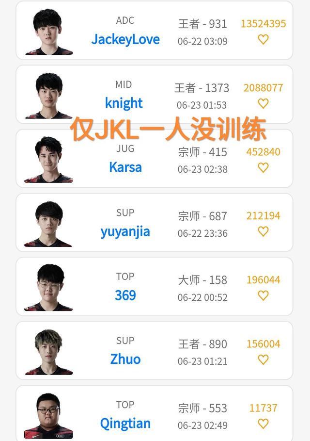 在比赛输掉之后。Tes战队的几名队员遗憾地回到了基地,上单晴天,打野卡萨,中单knight以及辅助的zhu o都进行了韩服的训练,尤其是knight在前锋的王者局中打出了三连胜,非常好的战绩。似乎在发泄着自己的不满吧。首发的五名队员,只有阿水没有进行韩服的rank,是不是并没有和队员一起回到基地呢?如果一直是这样的职业素养,我还是劝阿水,在名气还算好一些的时候退役吧,毕竟已经赚得盆满钵满,还有有钱的女友。