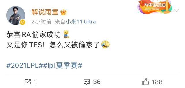 LPL解说纷纷发文感叹:赛后,LPL众解说也是发文纷纷发文感叹表示:“怎么又是TES被偷家了啊!”其中就包括解说米勒,在第三局比赛中,双方选手你来我往,状态都很好,无论是9分钟RA强行拿下峡谷先锋,还是TES打出的0换4,本场比赛出现了多次可圈可点的操作,虽然RA通过偷家获得胜利,但不能否认的是,LOL作为推塔游戏,推塔才是决定比赛胜负的关键,最后米勒也祝福了RA战队。