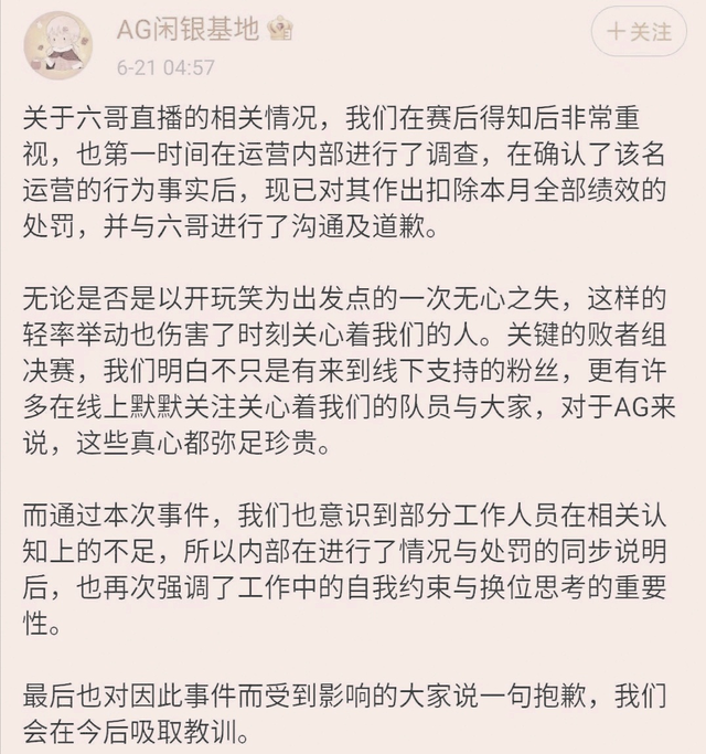 AG内部出现这种情况自然也引起了俱乐部的重视,事后,官方在运营内部进行了调查,确认了该名运营的行为事实,对运营做出了扣除本月全部绩效的处罚,并且向六点六进行了沟通和道歉。说句实话,自从KPL流行起所谓的“玄学”,各种匪夷所思的举动映入我们眼帘,稍微正常的点的有吃水果、水果皮,而这位AG的运营轻信解说比赛就能使一个队伍失败,多少有点神经质,事实证明没有六哥的解说AG也没见赢。