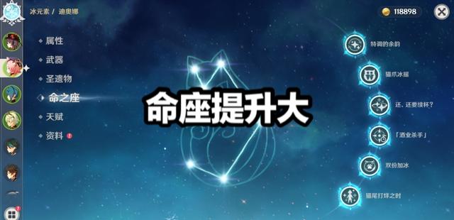 第一,迪奥娜的关键命座提升很大,这也是使用迪奥娜的核心所在,六命迪奥娜释放大招后,队友站在大招当中,如果生命值高于50%,那么将会获得200点元素精通的加持,生命值低于50%,治疗效果提高30%。重点就是200点元素精通,设想一下,用胡桃搭配迪奥娜,胡桃主要是堆生命值和双暴,但是对于打元素反应的胡桃来说,元素精通也很重要,可是在双暴面前只能舍弃元素精通,而六命迪奥娜弥补了胡桃的精通短板,加上200点精通,伤害提升50%以上,大招破百万是轻轻松松的事情。