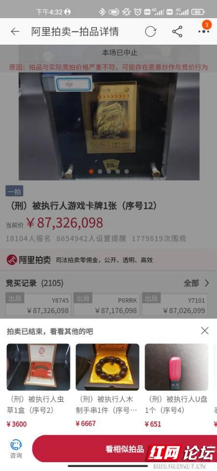 然后这人在19年中旬被捕,他的这些收藏品自然就要被依法拍卖。其他的什么手机、补品、红酒的拍卖过程都挺正常,唯独就这张限定的游戏王卡片。因为这张卡是嫌疑人从日本托友人购入的,在过海关的时候为了避税,把包装盒及证书都扔了。因为没有证书,并且法院方面也强调“品牌真伪不详”,所以把起拍价格定在了80块,参与拍卖的保证金仅有100元。