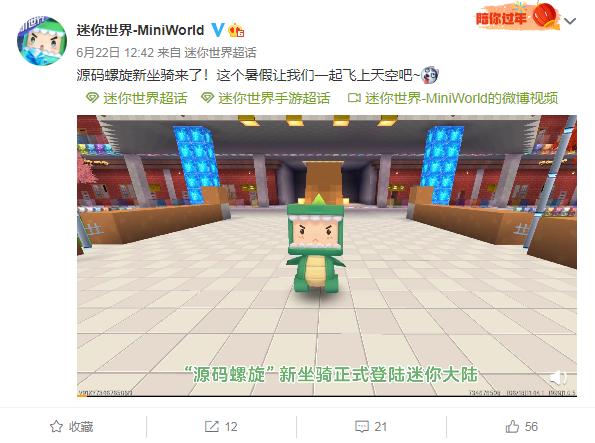 6月22日,《迷你世界》官方发布微博,向玩家介绍了全新的坐骑“源码螺旋”,随着微博的发布,该坐骑已正式进入商场以供玩家进行兑换。说到这,相信各位应该都注意到了,我所说的是兑换而并非购买,没错,这款全新的坐骑是免费的。玩家只需前往迷你编程做任务便可获取碎片兑换坐骑。