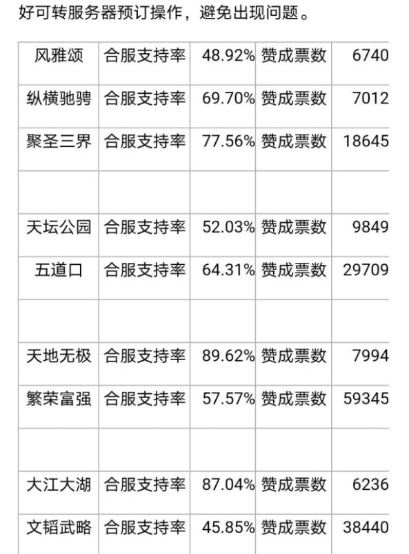根据游戏规则,想要完成“合服”,支持率必须达到60%以上,根据这一情况,我们来看看最新的合区公告。繁荣和文韬武略算是两个小烟花,本身具有一定的人气,如果是他们选择拒绝,那么也算是情有可原,但像是“风雅颂”这样的超级大鬼区为什么还会失败呢?平常连个人都没有,合区之后不就更热闹了吗?针对这个问题,大树想要和大家聊一聊。