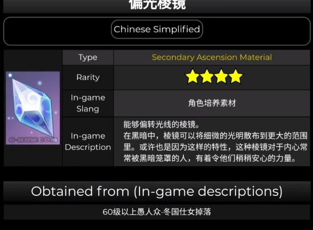 新敌人掉落【偏光棱镜】系列材料!第二种材料也是一种角色培养素材,这个材料名为【偏光棱镜】。偏光棱镜的官方介绍是:能够偏转光线的棱镜。在黑暗中,棱镜可以将细微的光明散布到更大的范围里。或许也是因为这样的特性,这种棱镜对于内心常常被黑暗笼罩的人,有着令他们稍稍安心的力量。这个材料是个系列材料,还有两个不同星级的系列材料。获取方式是讨伐稻妻地区的新敌人【冬国仕女】获得,不同等级掉落不同星级的材料。这个材料虽然是角色培养素材,但目前只知道能用来强化一些武器,比如五星武器【飞雷之弦振】。