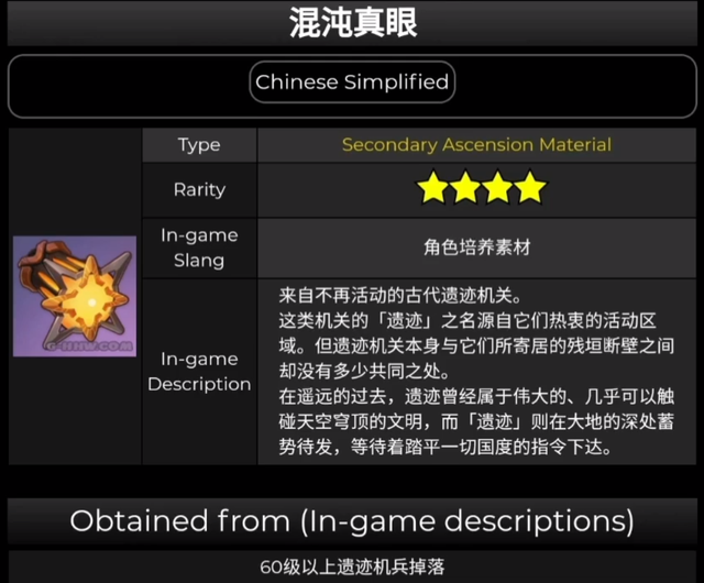 新敌人掉落【混沌真眼】系列材料!最后要介绍的这种材料,同样也是一个角色培养素材名为【混沌真眼】。混沌真眼也是一种系列材料,混沌真眼是系列中最高级别的材料。混沌真眼的官方介绍是:来自不再活动的古代遗迹机关。这类机关的【遗迹】之名源自它们热衷的活动区域。但遗迹机关本身与它们所寄居的残垣断壁之间却没有多少共同之处。在遥远的过去,遗迹曾经属于伟大的、几乎可以触碰天空穹顶的文明,而【遗迹】则在大地的深处蓄势待发,等待着踏平一切国度的指令下达。